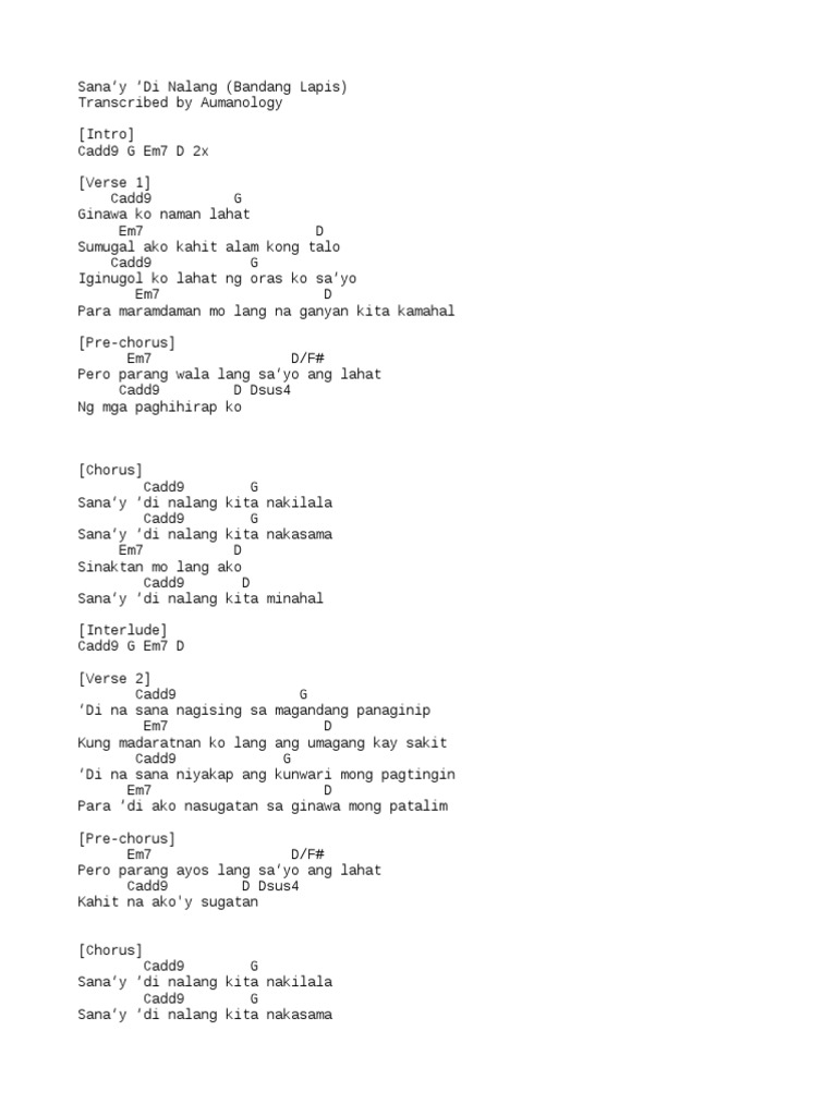 SanayDiNaLang BandangLapis ChordsCoverCopyright Disclaimer Under Section 107 of the Copyright Act 1976 allowance is made for fair use for purpose such. D B C G Em E Chords for Sanay Di Nalang - Bandang Lapis Lyrics Video with song key BPM capo transposer play along with guitar piano ukulele mandolin.